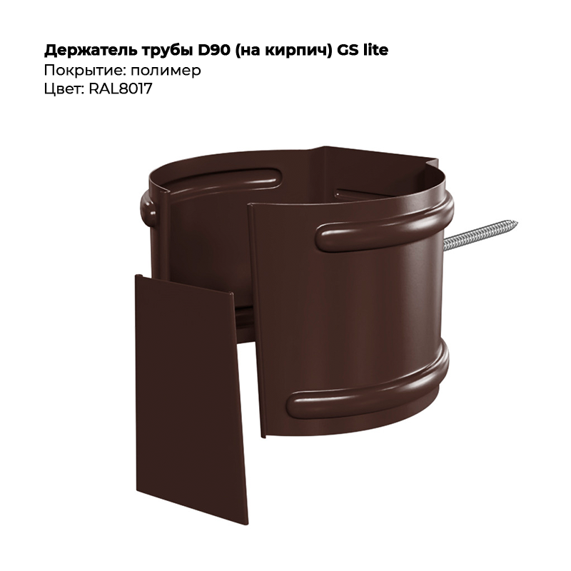 Держатель трубы D90 (на кирпич) GS Lite — это элемент крепления для фиксирования водосточной трубы диаметром 90 мм, предназначенный для установки на кирпичную поверхность, обеспечивающий надежное и удобное закрепление трубы в системе водостока.